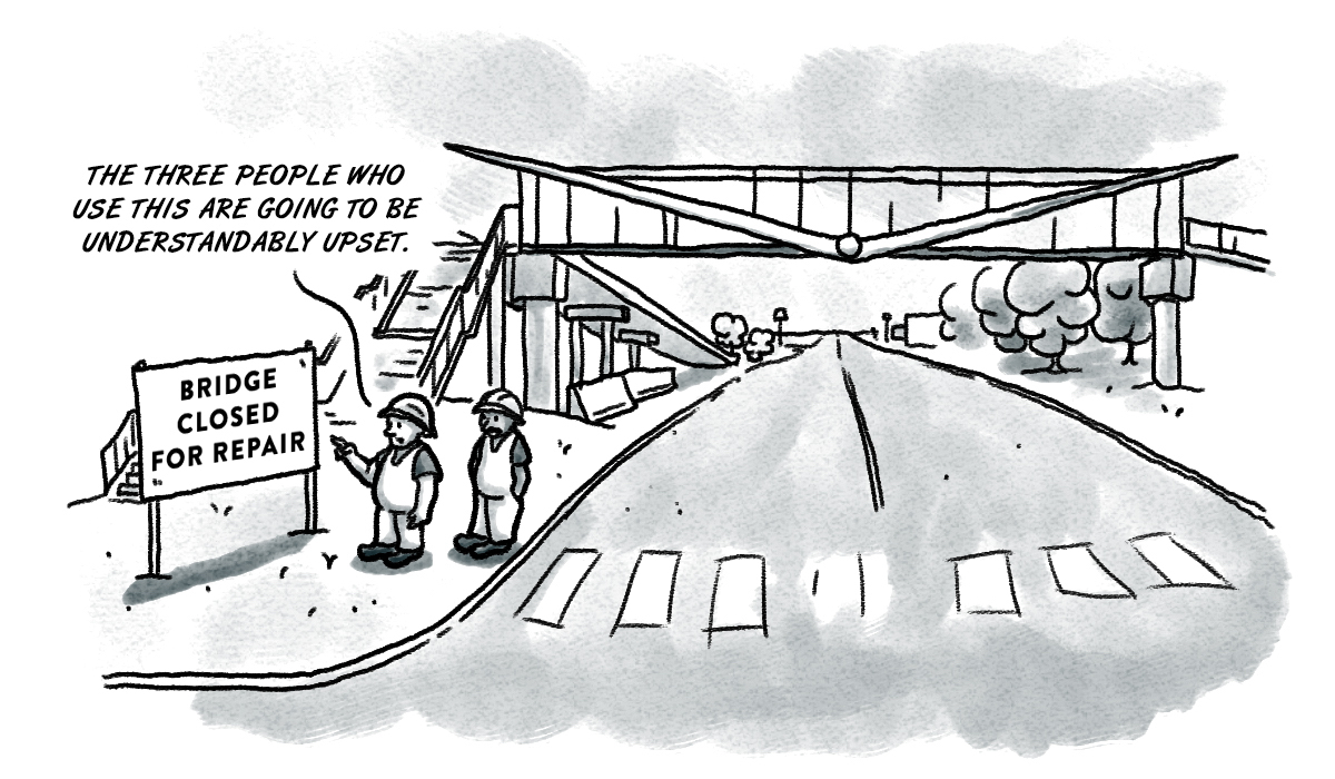 Yes, I’m sure that more than a handful of people use the pedestrian bridge at Northwest Expressway and Wilshire Boulevard, but I couldn’t give you any evidence of it if you asked me to. Call it “belief,” I guess.