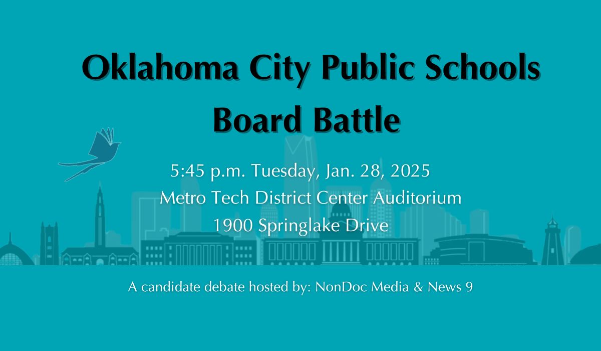 Hosted in partnership between NonDoc and News 9, the OKCPS Board Battle is scheduled for 5:45 p.m. Tuesday, Jan. 28, in the Metro Tech District Center auditorium, 1900 Springlake Drive in northeast Oklahoma City. Attendance is free and open to the public. The District Center entrance is accessible from Springlake Drive just west of Martin Luther King Avenue.
