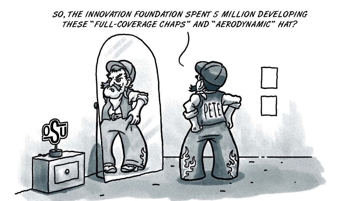 That got us wondering: What types of innovations are underway at OSU? The possibilities are boundless. With the NCAA shooting down the Cowboys’ QR-code football helmet last year, perhaps the innovators went back to the drawing board for some alternative Pistol Pete attire.