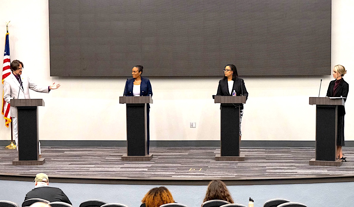 NonDoc Media editor in chief Tres Savage, left, asks a question of House District 97 candidates JeKia Harrison and Aletia Timmons while co-moderating a debate with News 9's Haley Hetrick on Tuesday, June 3, 2025. (Michael Duncan)