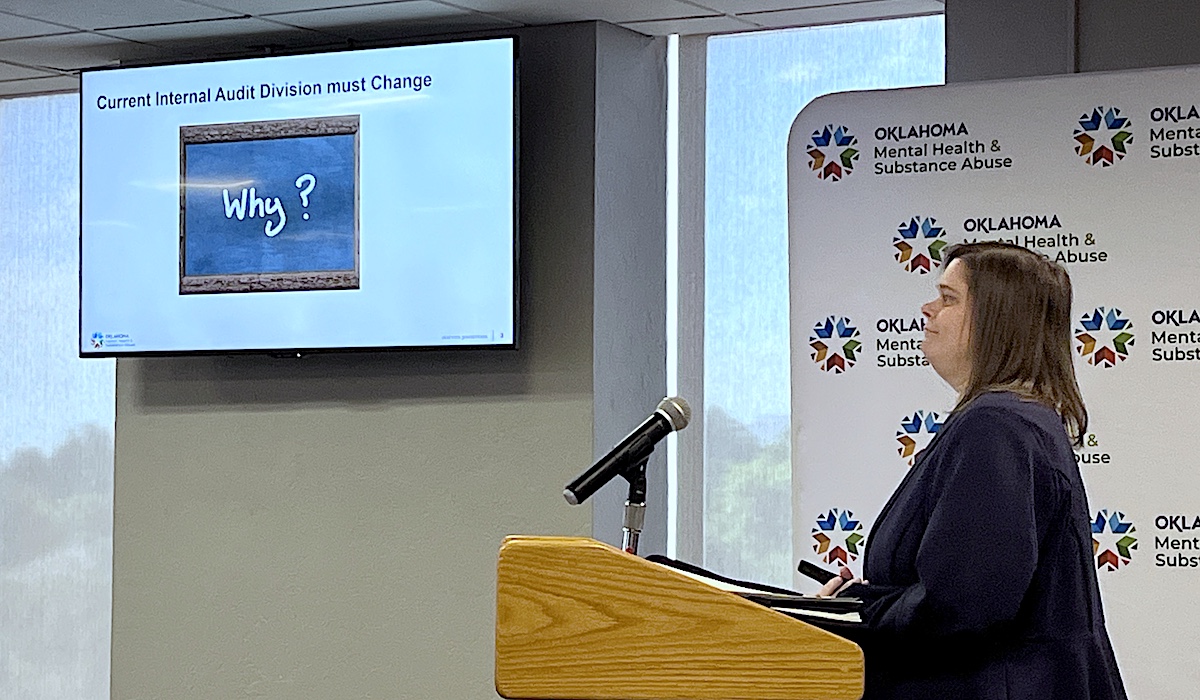 While the CFO search is ongoing, so is an effort to “reestablish” ODMHSAS’ internal audit office, which received board approval Thursday following an executive session. Before the board voted to enter executive session, however, Reinmiller briefly recognized Capps to begin a presentation. Capps, who has been with agency about six years, said she would “make the case for building a better internal audit division, particularly an independent internal audit division.”